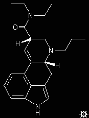 [3D .mol Image] SYNTHESIS : To a solution of 66 mg nor-LSD (see under ETH-LAD for its preparation) in 2 mL freshly distilled DMF under a nitrogen atmosphere, there was added 48 mg anhydrous K2CO3 and 41 mg propyl iodide. When TLC analysis indicated that the nor-LSD had been consumed (9 h) all volatiles were removed under a hard vacuum. The residue was solubilized in CHCl3 (5×5 mL) and the pooled extracts dried over anhydrous Na2SO4, cleared by filtration, and the solvent removed under vacuum. There was a residual white solid. This was separated into two components by centrifugal chromatography (alumina, CH2Cl2, nitrogen and ammonia atmosphere) the first of which was the major product. After removal of the solvent, this was dissolved in hot benzene, filtered and cooled. The addition of hexane prompted crystallization of N-propyl-nor-LSD (9,10-didehydro-6-propyl-N,N-diethylergoline-8b-carboxamide) as a crystalline product weighing 54 mg (72% yield dry). It had a mp of 87-88 °C.